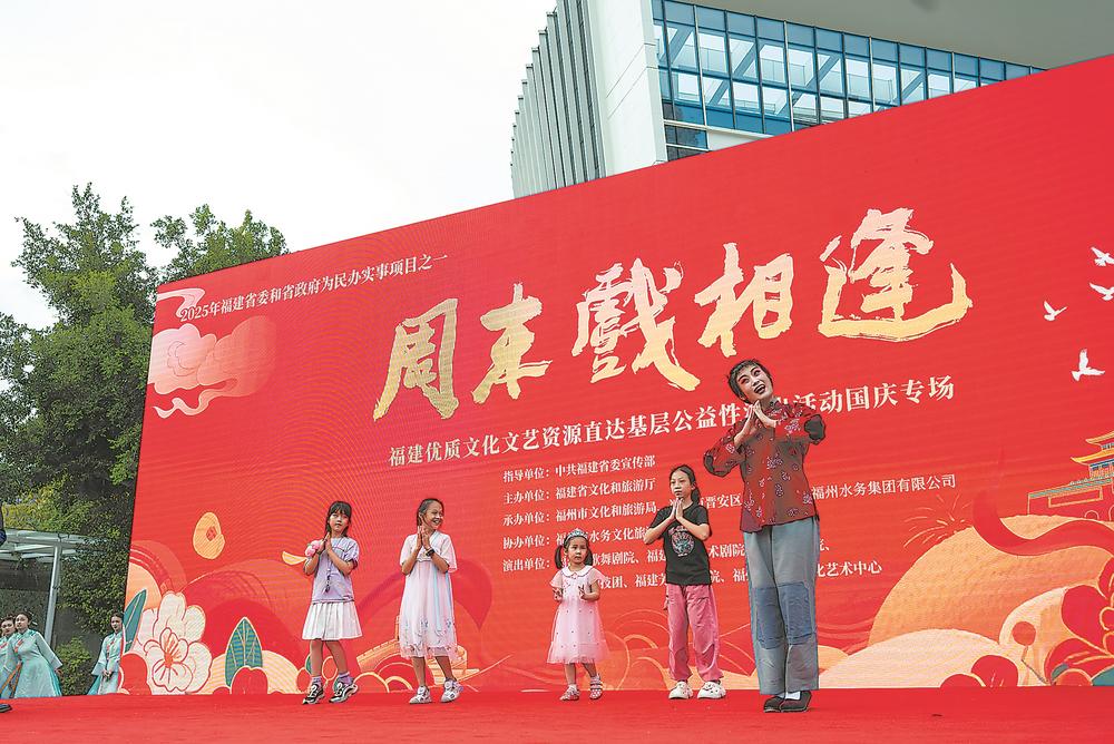 10月1日,“周末戏相逢”福建优质文化文艺资源直达基层公益性演出活动国庆专场在福州晋安湖公园青鸾广场举行,小朋友上台与福建京剧院的演员互动,学习京剧手势动作。(记者 施辰静 摄)
