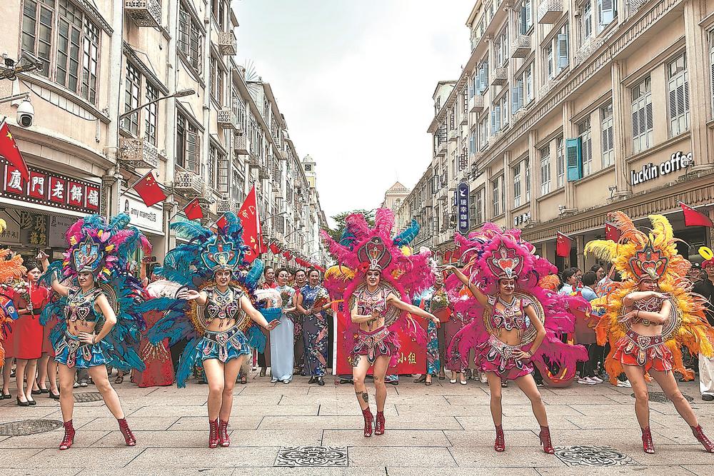 国庆中秋假期,厦门中山路将非遗民俗、光影艺术、多元演艺等元素深度融合,打造“日夜皆精彩、处处有亮点”的文旅盛宴。图为10月1日,玲玲马戏团舞者在厦门中山路进行互动表演。(记者 林梓健 通讯员 汪桓可 摄)