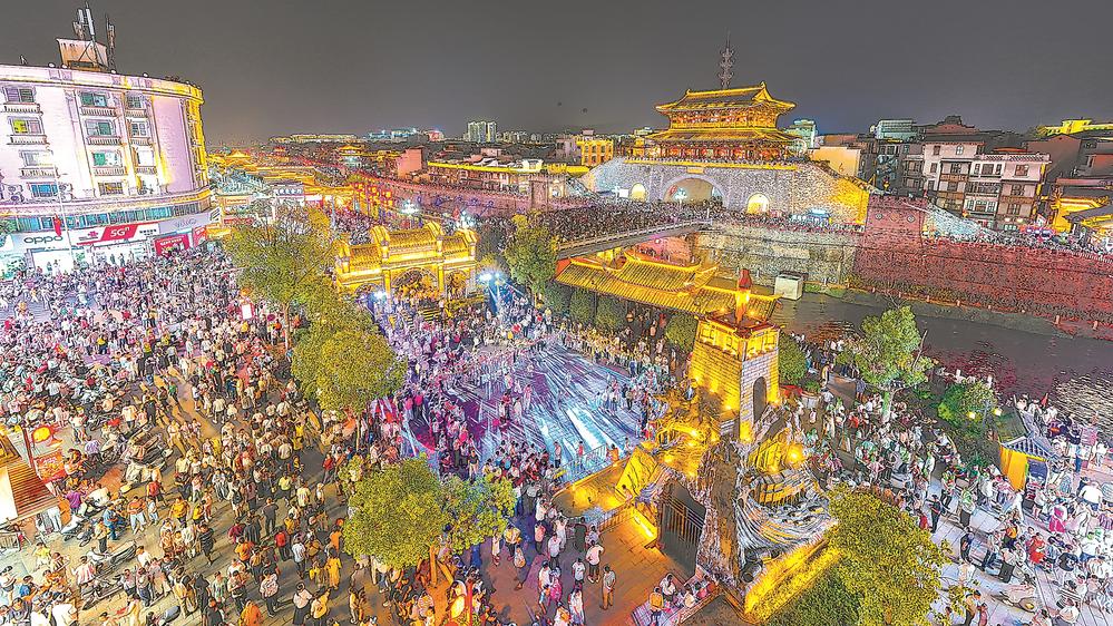 10月1日,长汀古城各景点人潮涌动。国庆中秋假期,长汀县在城区各景点推出以“来了就是客——双节同辉 光影盛宴”为主题的文旅活动30余场,满足游客多种游玩需求。(通讯员 朱芳彬 廖健伟 记者 徐士媛 摄)