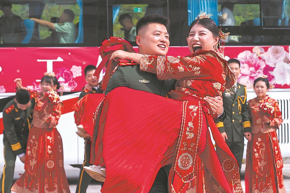 10月1日,新郎抱着新娘上婚车。当日,一场融合“家国情怀、军营特色、传统礼俗”的集体婚礼在武警第二机动总队某支队营区内隆重举行。8对新人身着庄重礼服与典雅秀禾服,在战友与亲属的共同见证下,为祖国生日献上最温情的礼赞。王晨鑫 摄