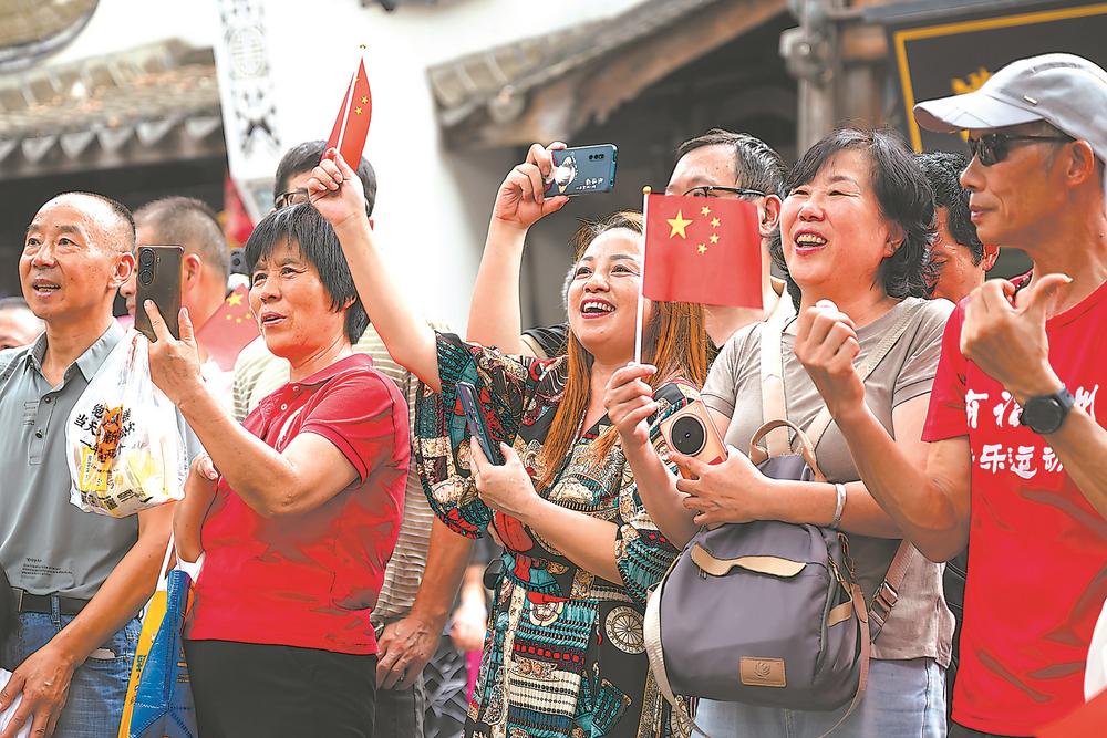 10月1日上午,福州市闽都文化艺术中心带来的快闪表演在三坊七巷风雨廊上演,众多市民游客举着小红旗,驻足观赏并共同歌唱《我和我的祖国》。施辰静 摄