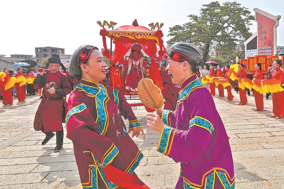 10月1日,泉州市泉港区后龙镇涂坑村,当地通过传统婚嫁仪式的沉浸式演绎,再现昔日海丝商埠的热闹喜庆,让现场市民和游客在欢声笑语中触摸历史、感受民俗,欢度国庆、乐享假期。林弘梫 摄