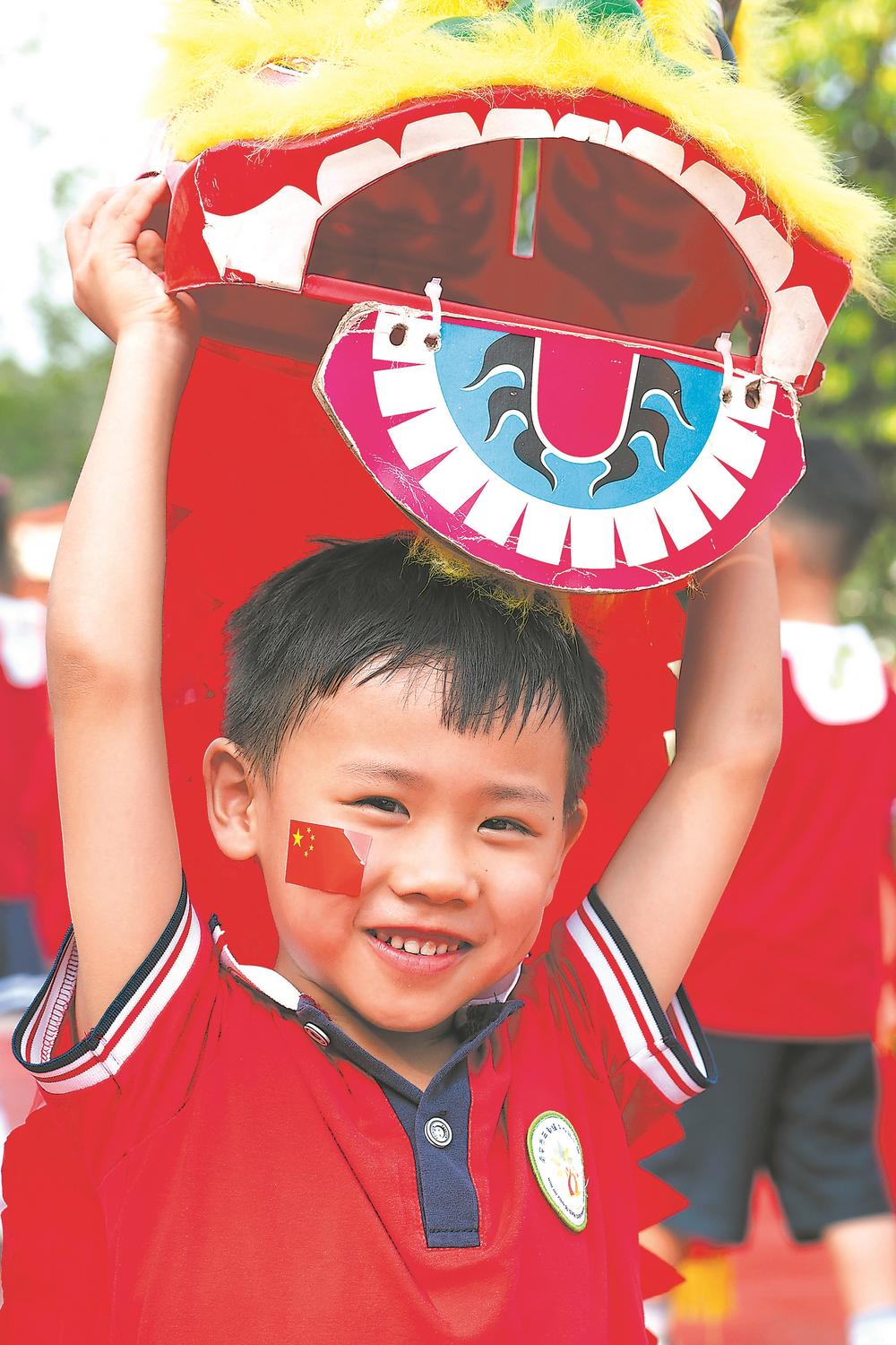 9月30日,南安市英都镇,参加庆国庆丰收节的孩子表演舞狮。王毅 摄