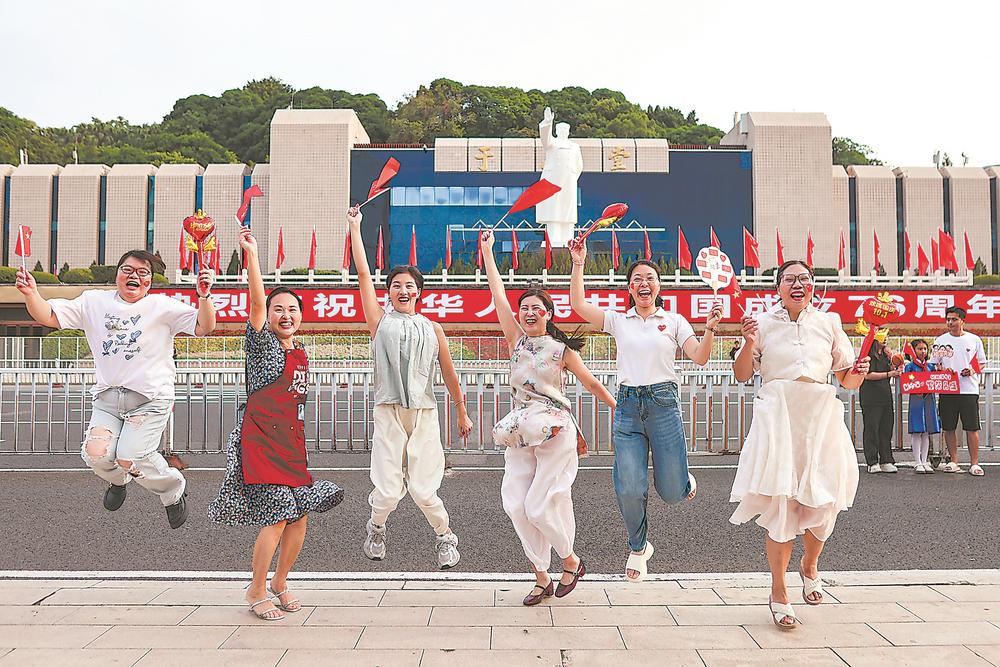 10月1日,福州五一广场,市民观看升国旗仪式后欢庆。叶民民 摄