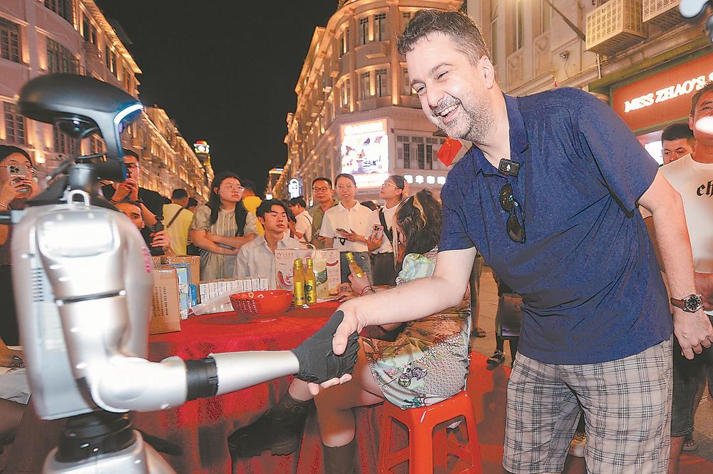 9月22日,2025海峡两岸中秋博饼状元王中王大赛在厦门市中山路步行街西段开幕,参加博饼的外国游客向演出机器人“借手气”。沈威 摄