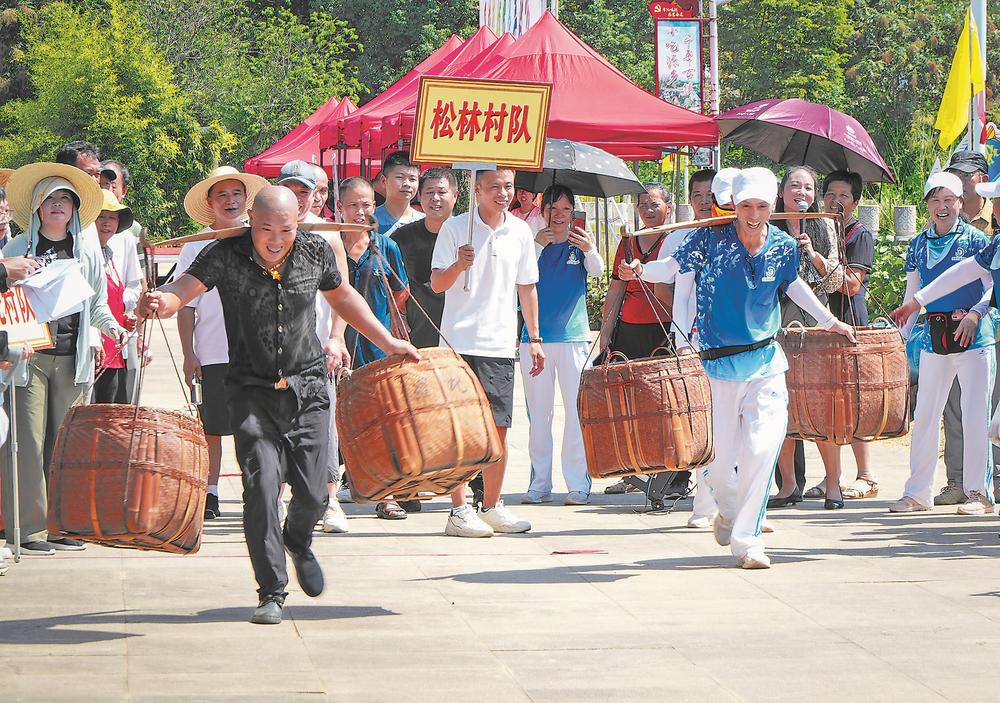 5日,三明市沙县区夏茂镇举办农民丰收节,来自全镇各村和社会各界的9支代表队在挑粮接力、插秧接力、拔河等趣味比赛中感受乡村生活的魅力。图为挑粮接力比赛。(通讯员 薛辰怡 俞和江 摄)