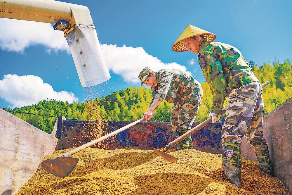 近日,德化县龙门滩镇霞碧村的梯田迎来水稻丰收季。村民们穿梭田间,割稻、打谷、装袋,忙碌身影中满是丰收喜悦。(许华森 林婉清 摄)
