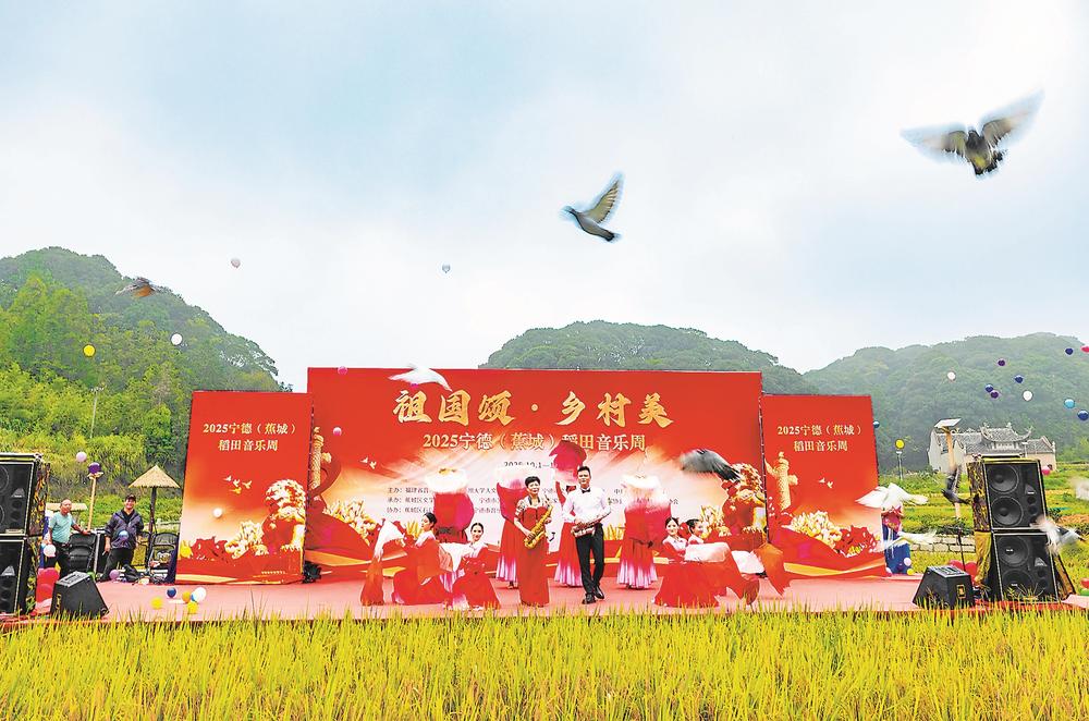 1日至3日,由福建省音乐家协会、福州大学人文社会科学学院及宁德市文联、蕉城区委宣传部联合主办的“祖国颂·乡村美”2025宁德(蕉城)稻田音乐周在蕉城区石后乡下竹洋村举办。本次稻田音乐周将高雅艺术融入丰收景色,为市民游客提供了独特的文化体验。(通讯员 王志凌 摄)