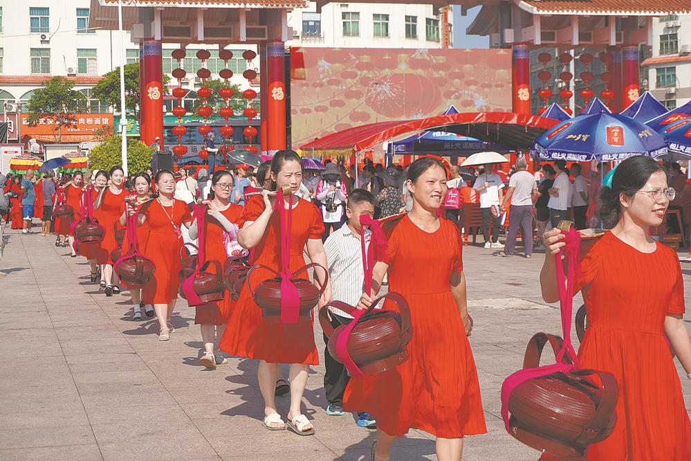 3日,莆田中秋传统民俗活动“送秋”在涵江区白塘湖开展。“送秋”习俗起源于宋代,每逢中秋节前夕,出嫁的女儿精心准备礼物回娘家探望父母。当日,百名莆田女儿挑着担盘集体回娘家“送秋”。(见习记者 陈阳阳 通讯员 关淋 朱秀花 摄)