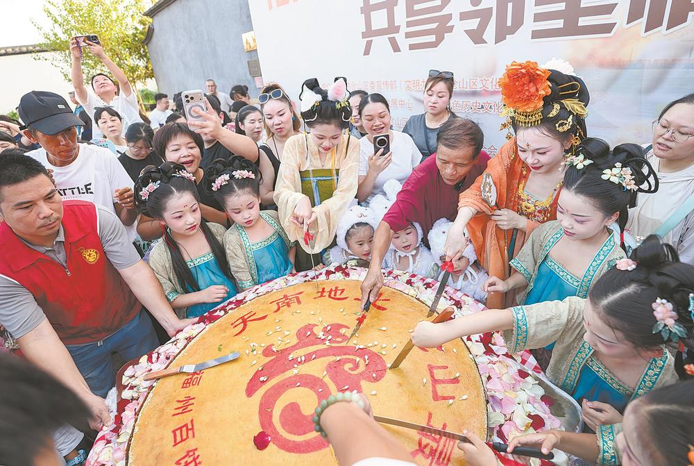 5日,福州市仓山区中秋民俗活动在梁厝特色历史文化街区举办。“嫦娥姐姐”携数名“兔宝宝”穿梭在市民游客之间,送茉莉花、猜灯谜、摆塔、分享月饼、拜月仪式等轮番上演。图为连续四年如约而至的“最大月饼分享”环节,市民游客一起分享直径一米多的“福州最大月饼”。(记者 施辰静 摄)