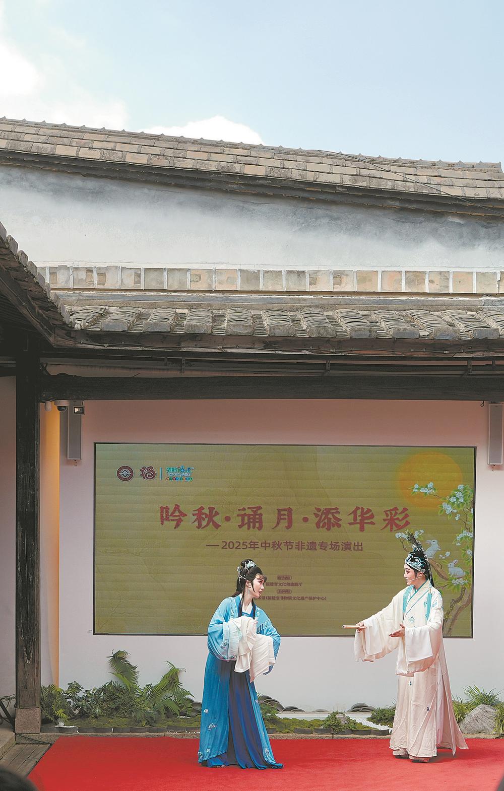 6日,由福建省艺术馆(福建省非物质文化遗产保护中心)主办的“吟秋·诵月·添华彩”——2025年中秋节非遗专场演出在福建省非物质文化遗产博览苑举行。活动将中秋意境与非遗技艺紧密串联,让游客在团圆氛围中感受传统艺术和民间技艺的魅力。(记者 肖榕 摄)