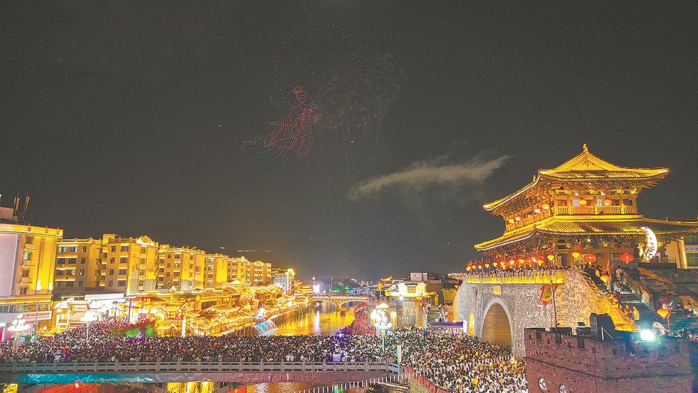 6日晚,长汀县千台无人机上演“嫦娥奔月”的夜空盛宴。(通讯员 朱芳彬 记者 徐士媛 摄)