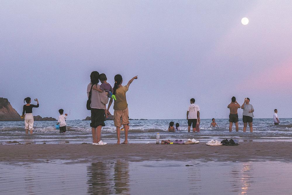 6日中秋节,傍晚时分,圆月初升,游客在莆田湄洲岛沙滩上一边戏水一边赏月。 (记者 张永定 摄)