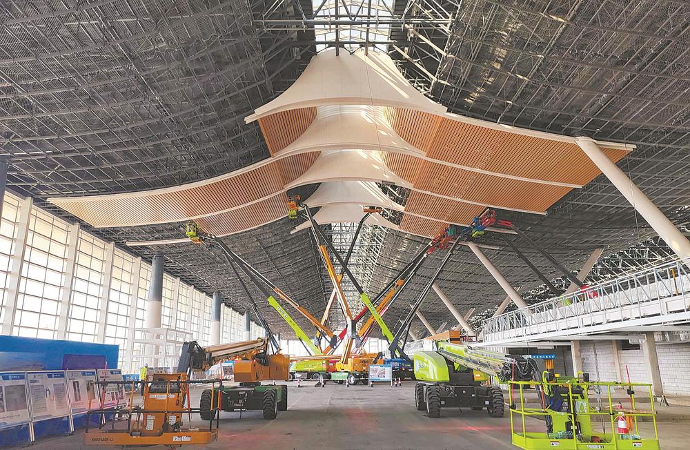 节日期间,福州长乐国际机场二期T2航站楼进入精装修阶段,约2500名建设者、140台各类机械冲刺关键节点。图为吊顶龙骨安装与墙面饰面板铺设施工现场。(记者 张文奎 通讯员 郑文元 摄)