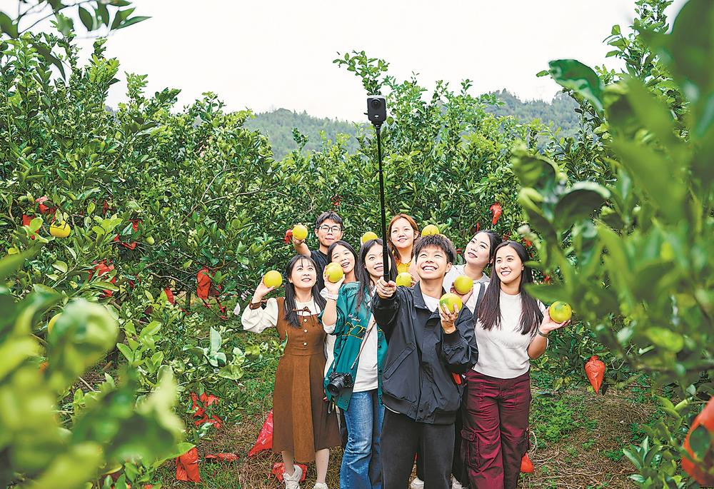 26日,位于永安市洪田镇的横山湾生态休闲农场迎来葡萄柚、洛神花等作物的采收季,一群前来游玩的高中生手捧刚采摘下的葡萄柚,欢快地合影留念。