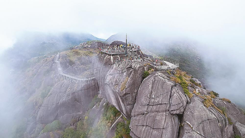 近日,德化县石牛山风景区云雾蒸腾,登顶游客置身于林海与云雾交织的景致中。