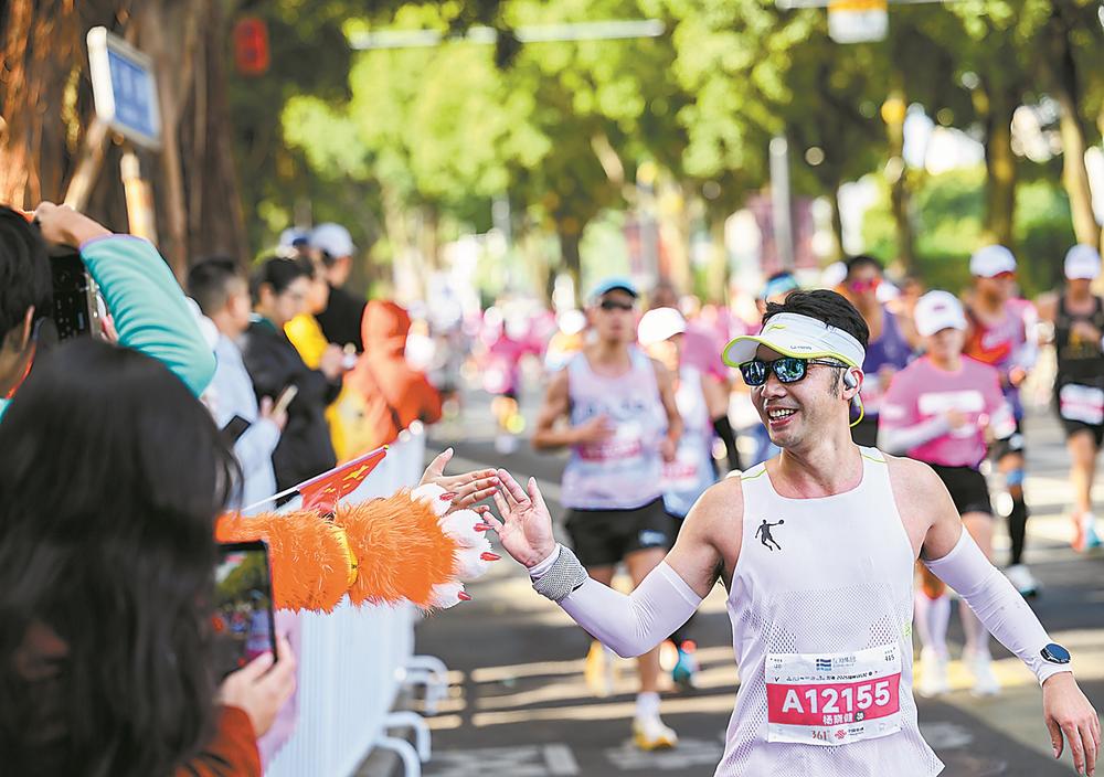 选手与赛道旁加油的观众击掌。记者 施辰静 摄