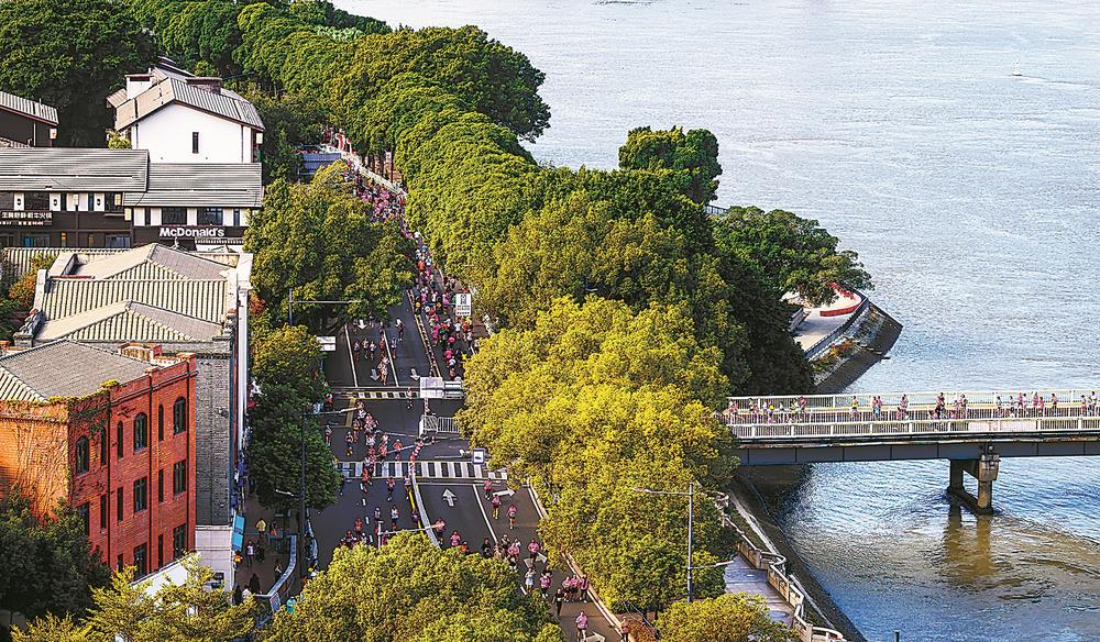 选手们奔跑在烟台山边美丽的江滨赛道上。记者 施辰静 摄