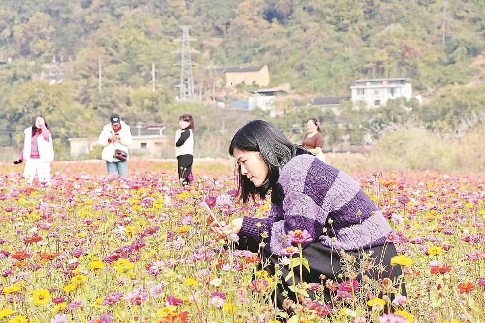 冬日,福安市穆阳镇葛兰坂的格桑花绚丽盛放,粉白、绯红、淡紫的格桑花铺展在田垄间,在冬日暖阳里轻晃,成为一道亮丽的风景线。图为17日,游客在格桑花海里拍照打卡。(吴其文 摄)