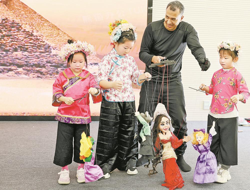 图为16日,埃及埃尔马鲁萨剧团的艺术家与泉州市温陵实验幼儿园的小朋友共同表演提线木偶。(通讯员 林升 摄影报道)