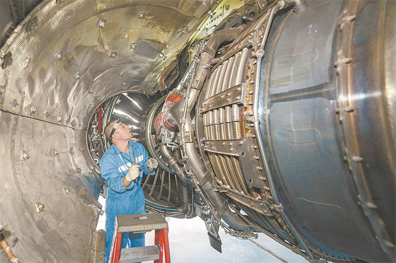 近日,在厦门航空福州维修基地,一名机务工程师在对波音737MAX机型的涡轮发动机进行C1检工作。