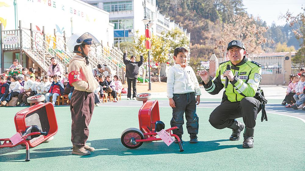 1月14日,泰宁铁骑队员化身“安全导师”,走进辖区五谷幼儿园,开展一场沉浸式交通安全宣传活动。活动以趣味互动形式为萌娃们送上一份心意满满的“安全大礼包”,让交通安全知识在欢声笑语中入脑入心。图为铁骑队员为孩子们讲解交通规则。(记者 庄紫怡 通讯员 熊明欢 摄影报道)