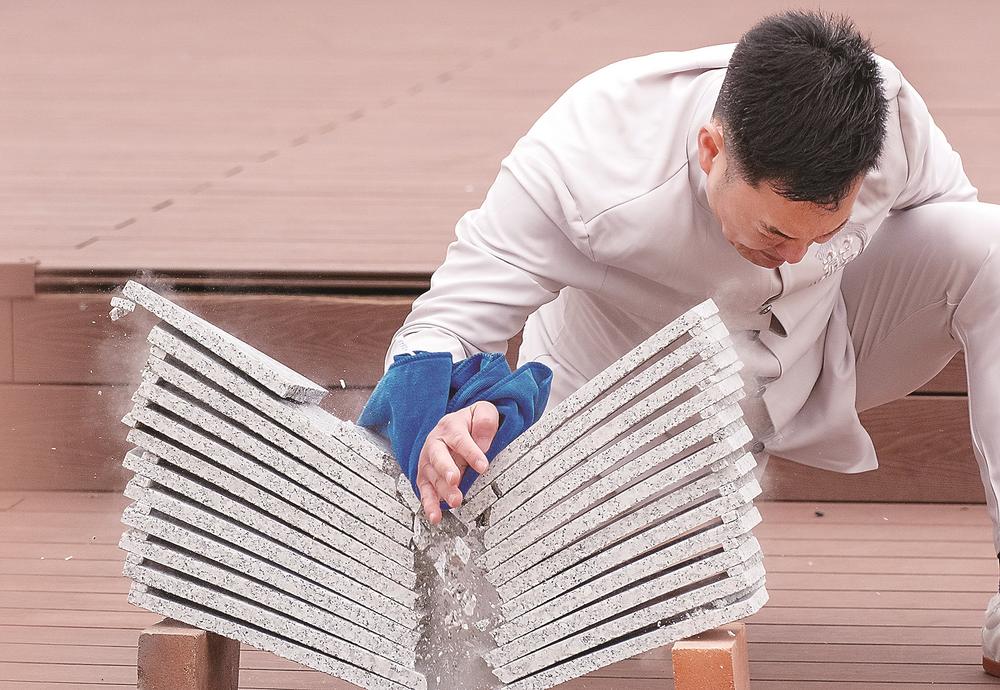 鸣鹤拳非遗代表性传承人黄晓东表演徒手劈石板。