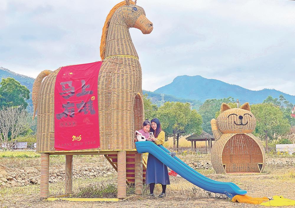 26日,泉港区涂岭镇小坝幸福里农场,蒙古包、“马上有钱”稻草马滑滑梯、稻草招财猫、海盗船等游乐项目丰富多彩。小坝幸福里农场位于泉港区小坝蒙古族特色村,这里是福建唯一的蒙古特色村落。深厚的少数民族文化底蕴,为游客体验民族风情提供了独特的资源基底。图为游客打卡“马上有钱”稻草马滑滑梯。(通讯员 郭菲凡 摄影报道)