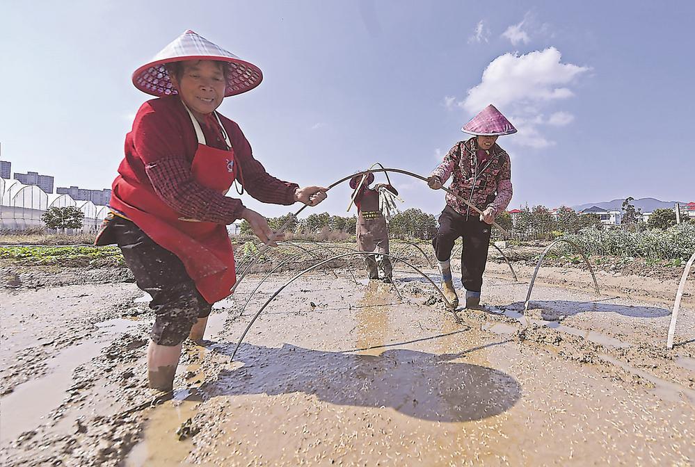 在位于泉州市泉港区界山镇鸠林村的育秧基地,稻农正有条不紊地给育秧田架设覆膜支架。(