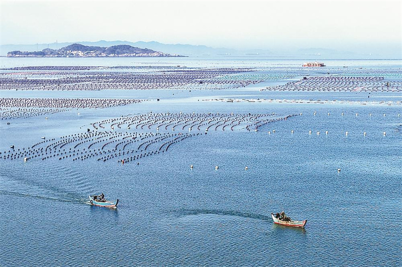 近日,福州市连江县赤才村海域海洋牧场养殖区一派繁忙。养殖工人驾驶渔船穿梭在生态养殖浮筏之间,有序开展投饵、管护、巡查等海上生产作业。(王旺旺 摄)