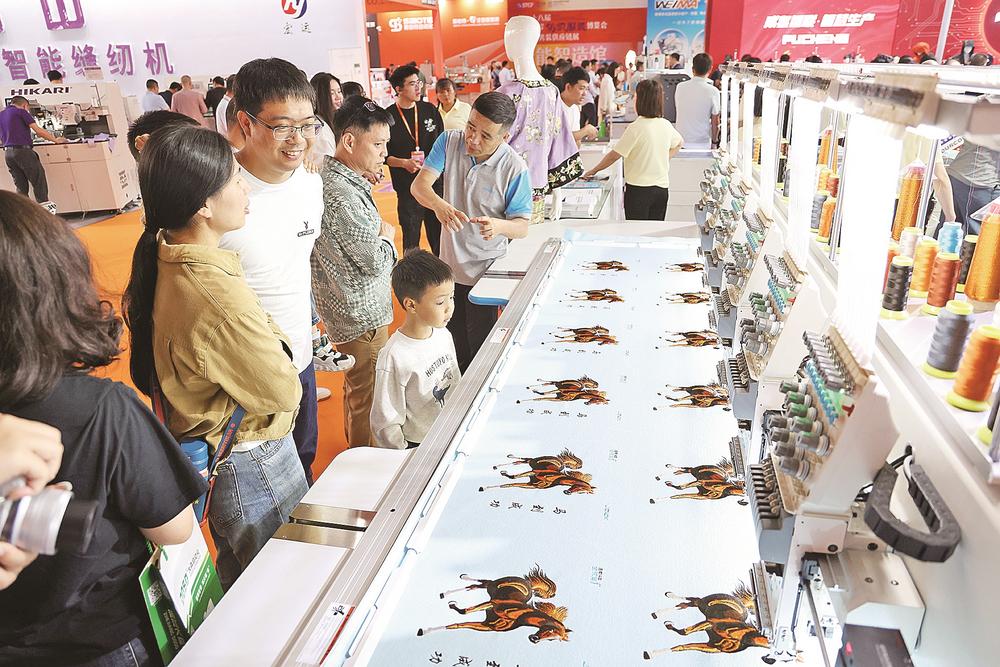 参观者在博览会上观看智能纺织设备。姜克红 摄