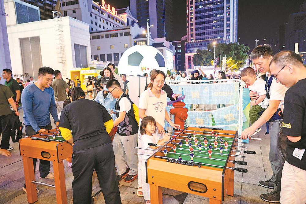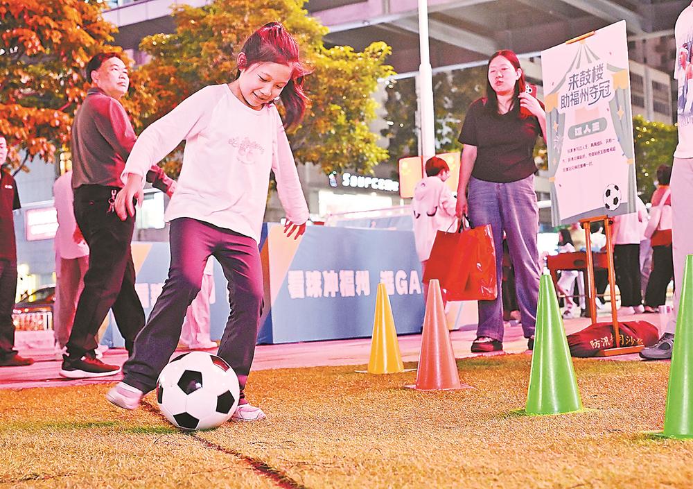 市民在福州东百中心观赛点参与足球小游戏。(记者 游庆辉 摄)