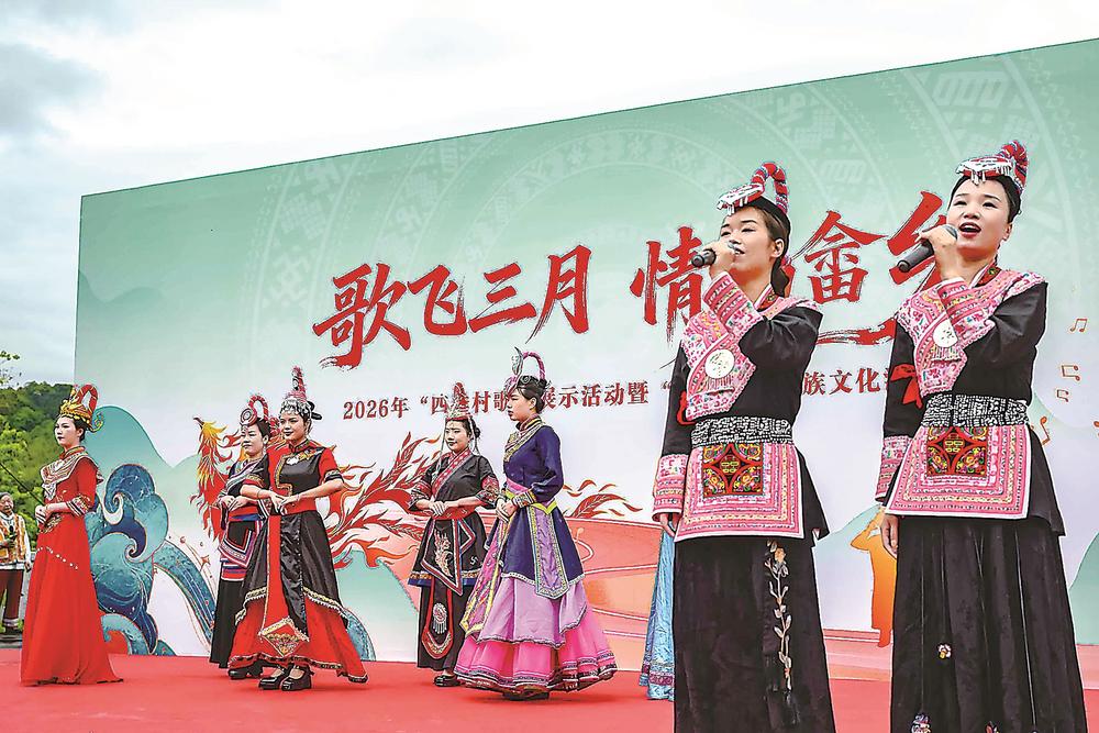 23日,福州市晋安区唯一的畲族聚居乡——日溪乡举办“三月三”畲族文化活动。现场,“山歌对对碰”展示了畲族山歌从古老传承到当代创新的动人图景,还有抛茶青、赶野猪、板鞋竞走等畲族传统特色竞技项目,吸引了众多游客参与。(通讯员 陈暖 记者 陈欢欢 摄