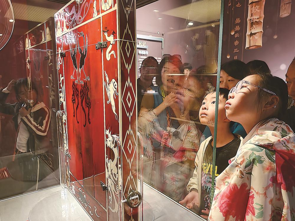 展厅内还有多件重磅文物同步亮相。其中,孔子徒人图漆衣镜(复制件)是迄今所见最早的孔子形象实物;被网友称为汉代“社牛”的熊形玉嵌饰,第一次走出江西到外省展出。展览还首次在我省完整呈现西汉诸侯最高规格的礼乐配置乐器“三堵”悬乐(一堵编钮钟、一堵编甬钟、一堵编铁磬),再现汉代王侯的礼乐风貌。