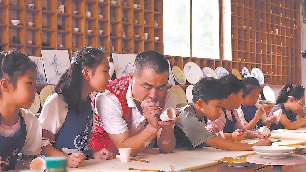 黄涛向孩子们传授红绿彩烧制技艺。(资料图片)