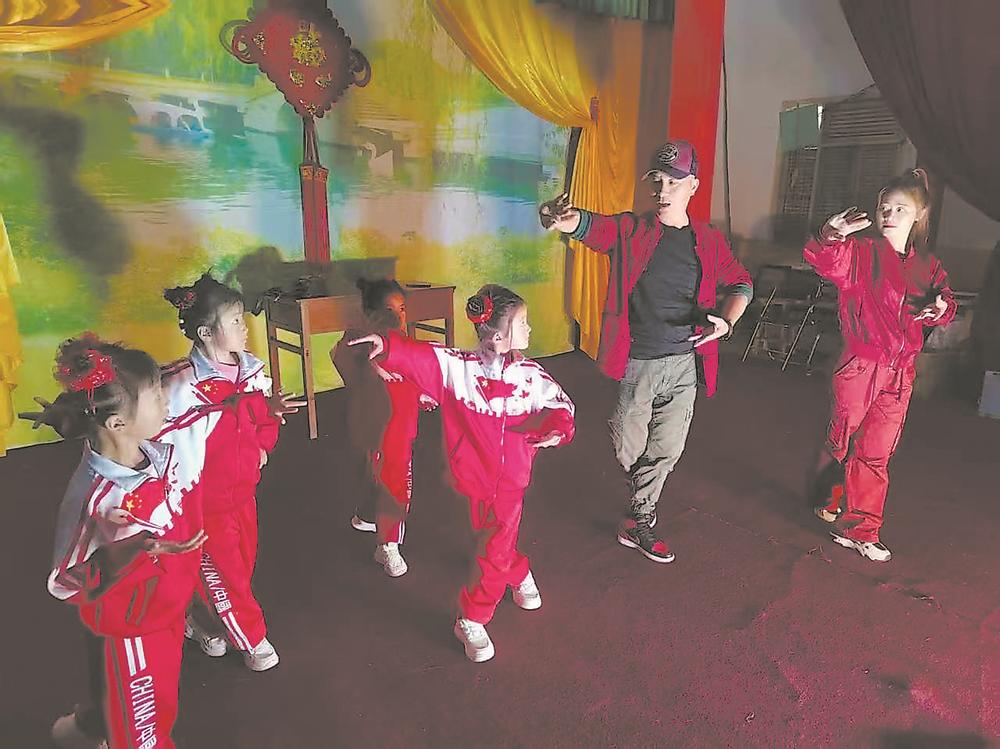 “文特派”蔡宣庚(右二)在九曲村指导小演员戏曲动作。
