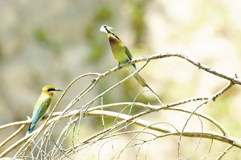 7月,暑气蒸腾,骑马山更加热闹起来,空中不时回荡着栗喉蜂虎独特的“口哨声”。随着繁殖季节步入中后期,栗喉蜂虎的巢穴中陆续迎来了许多新生的鸟宝宝。