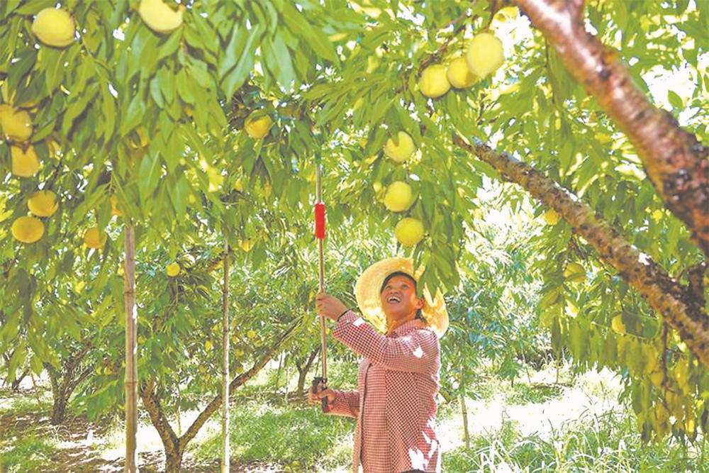 果农在玉萍果园种植专业合作社的果园采摘黄桃。