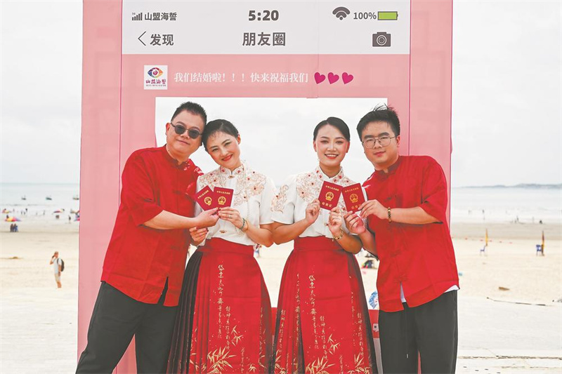 8月30日,平潭龙王头海洋公园,海风轻拂着衣角,暖阳洒在喜庆的红毯上。在这里,以“福遇良缘,情牵两岸”为主题的第三届闽台“山盟海誓”集体婚礼浪漫启幕,11对闽台新人在此许下“白首之约”。