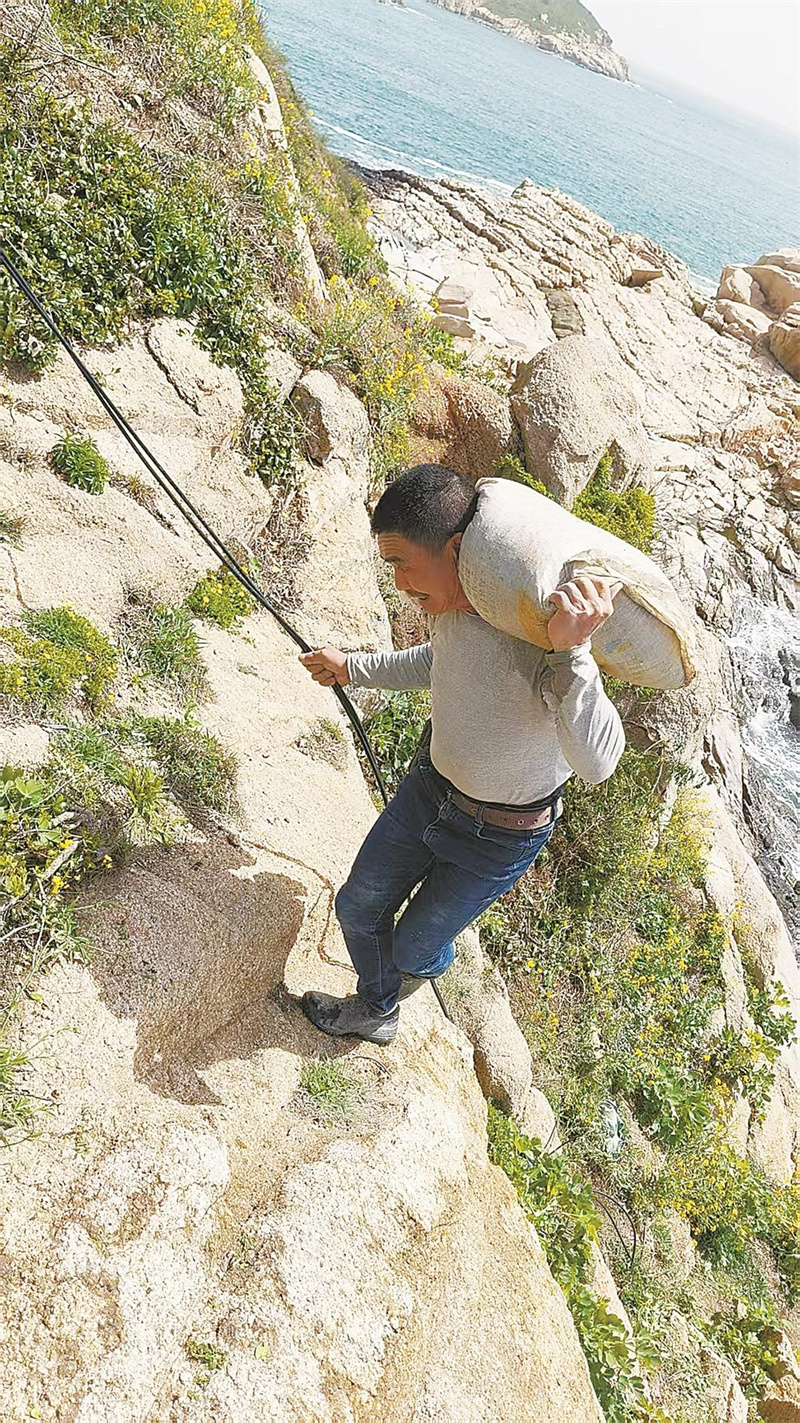 工人扛砂石上岛铺设中华凤头燕鸥保育区。