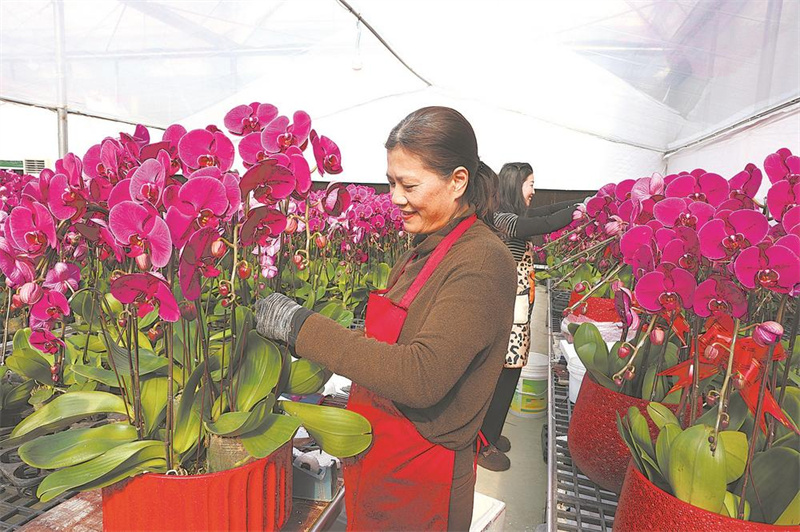 “当前基地蝴蝶兰已销往福州、漳州、泉州等多地。随着春节临近,销量不断增长,这段时间我们又增加了10多个人手。作为种植户,我们也将继续加强品质管理,优化栽培技术,全力保障年宵花市场供应。”卢玉花说。