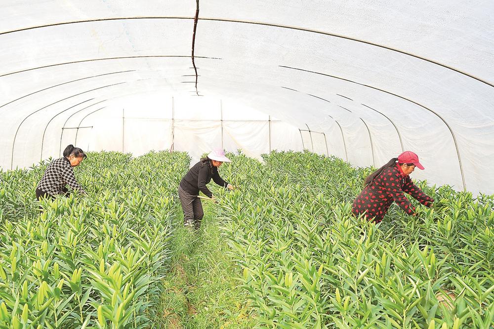1月14日上午,王台镇井窠村,冬日的寒意已漫过田垄,百合种植大棚内却暖意十足。