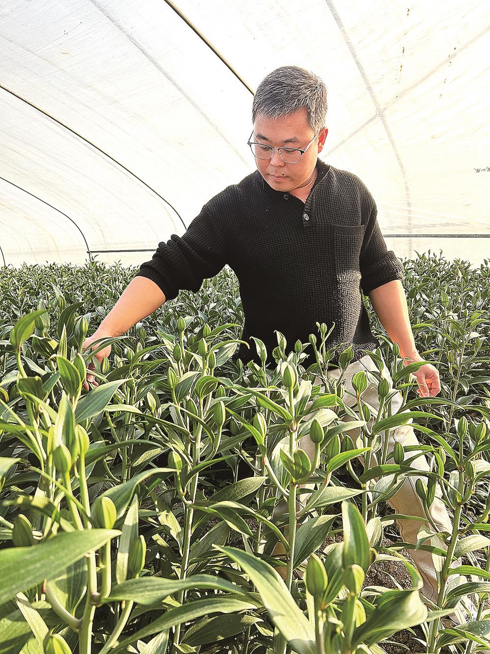 魏长俊在大棚内查看百合花生长情况。陈黎慰 摄