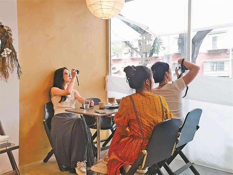 年轻人聚在“红桃咖啡”拍照打卡。赵文娟 摄