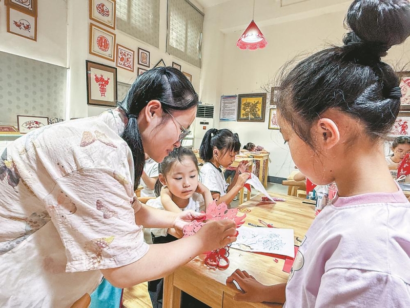 非遗代表性传承人陈水云(左一)指导学生练习剪纸。