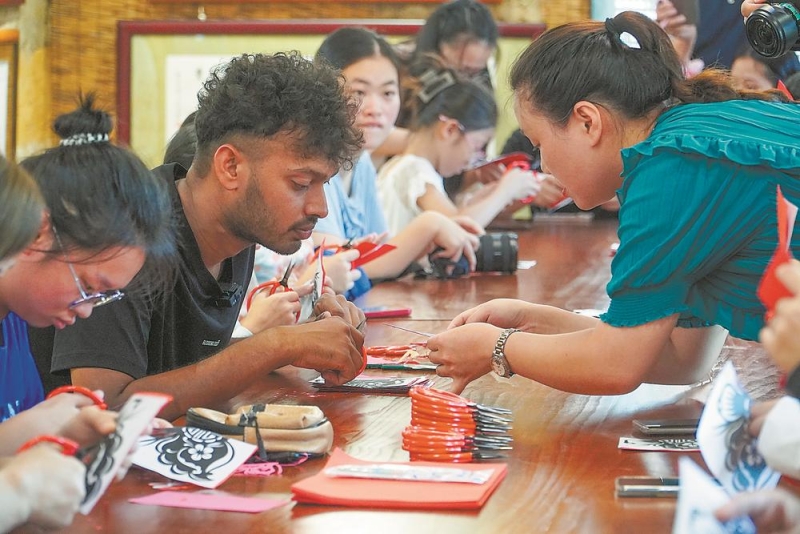 当时,50多名海外青年齐聚寿宁下党村,围着陈水云和吴秋凤等人学习剪纸。一位来自玻利维亚的姑娘学着剪“福”字,剪着剪着,不由自主哼起小曲儿。“大家都非常开心,国别虽不同,但剪纸拉近了我们的距离。”陈水云说。