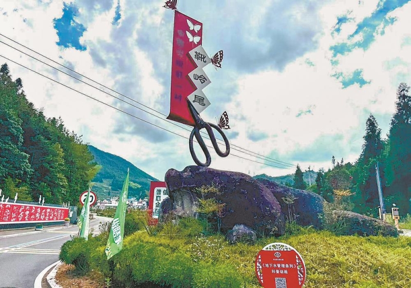 驱车从柘荣县城出发,不到15分钟,一把巨型剪刀雕塑赫然立于岩石之上,红底白字写着“靴岭尾”。走进这个曾经默默无闻的村子,仿佛步入露天剪纸艺术馆:民居外墙上是巨型剪纸图案,路边灯箱采用镂空剪纸设计,剪纸体验馆内,游客聚精会神剪刻。