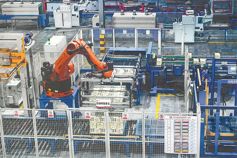 福建盼盼食品集团5G智慧工厂的饮料产品自动包装生产线 新华社