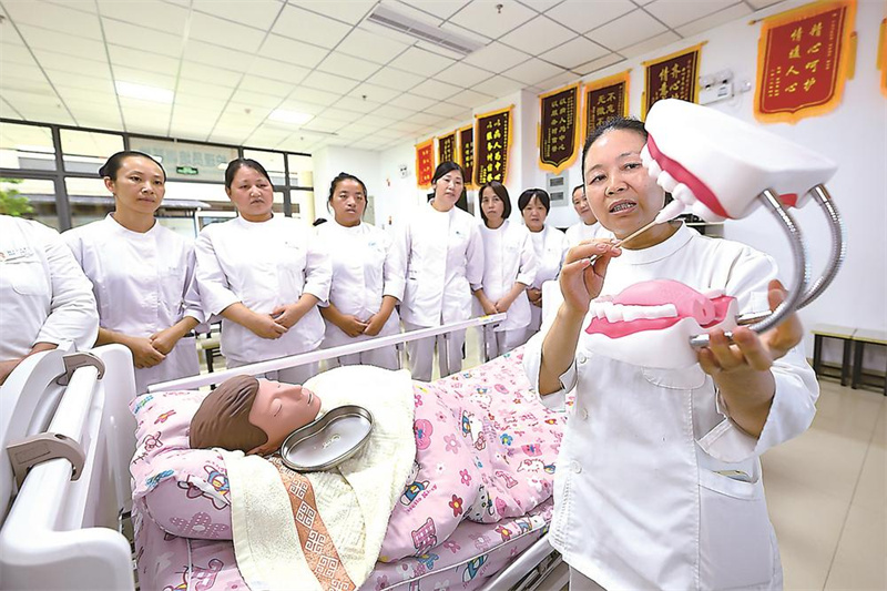 “十四五”期间,我省在全国率先开展免陪照护服务试点工作。图为在宁化县总医院的护理员培训基地内,培训师在讲解口腔清理要点。