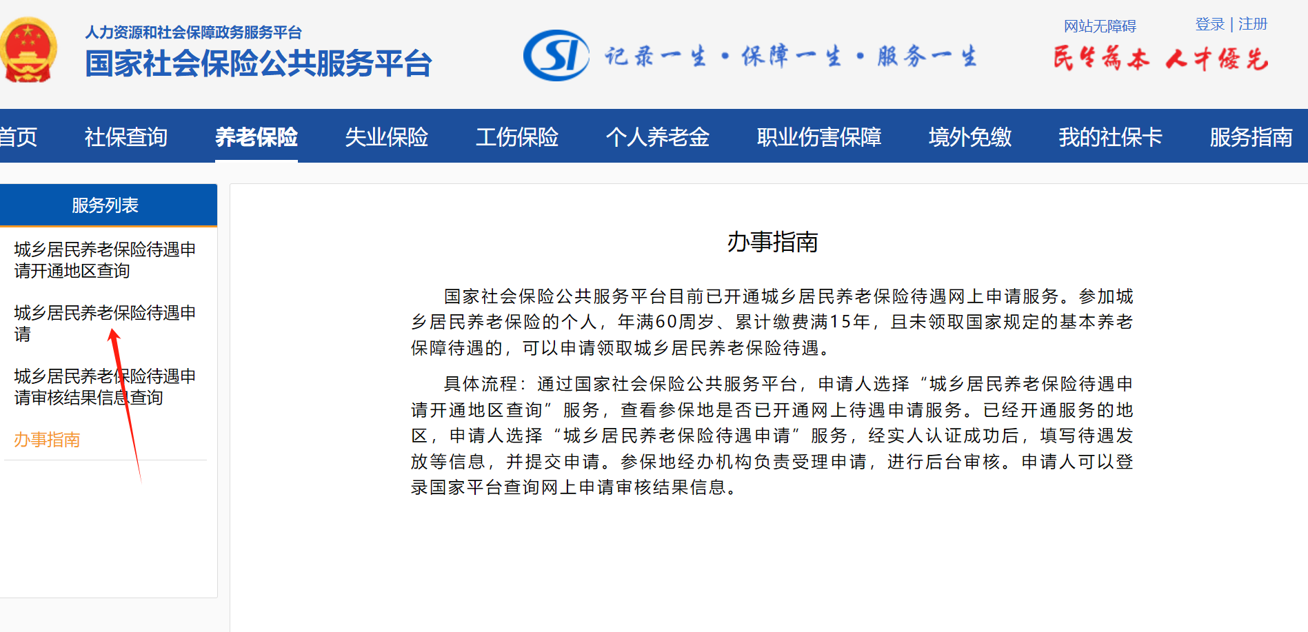 进入国家社会保险公共服务平台——选择“养老保险”——选择待遇申请“城乡居民养老保险待遇申请”——选择参保地——填写参保登记信息、待遇发放信息——上传相关材料——提交申请。